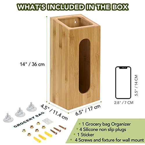 - Easy Wall-Mounting – This bag dispenser for plastic bags comes with everything you need for a seamless installation: 4 screws with wall-mounting fixtures, 4 nonslip silicone plugs, and a sticker. Slight variations in bamboo color is expected as it is a natural material without any processing or color treatment.