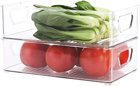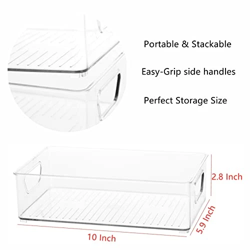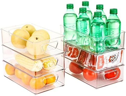 - Clear bins with built-in and easy-grip side handles make it easy to transport items; Getting things in the back of the frig a breeze. No more removing things one by one to get to things in the back.