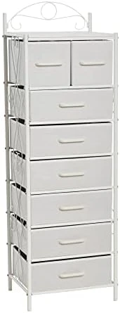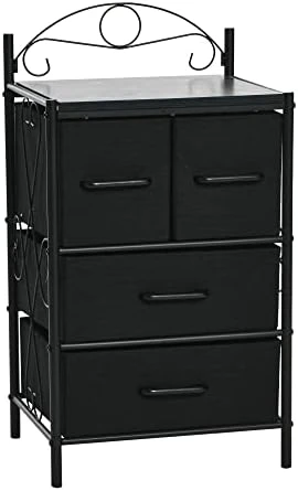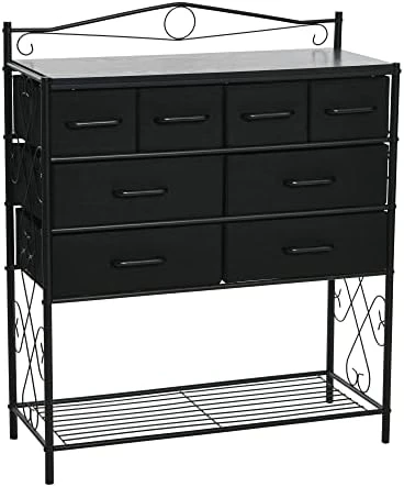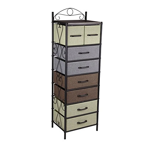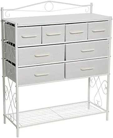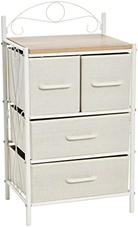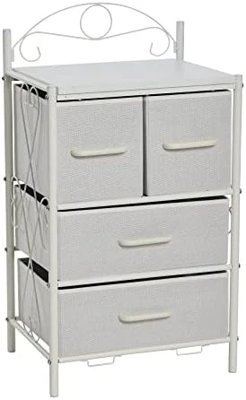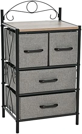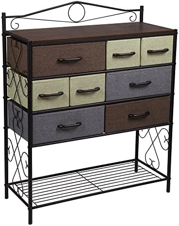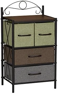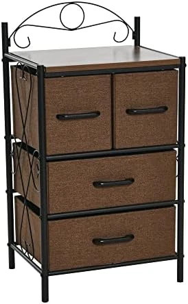 - Quality Materials and Construction: Durable steel legs and frame paired with high quality engineered wood finished in scratch resistent wood grain laminate, cloth drawers, and plastic handles.