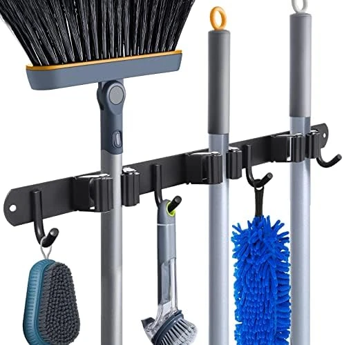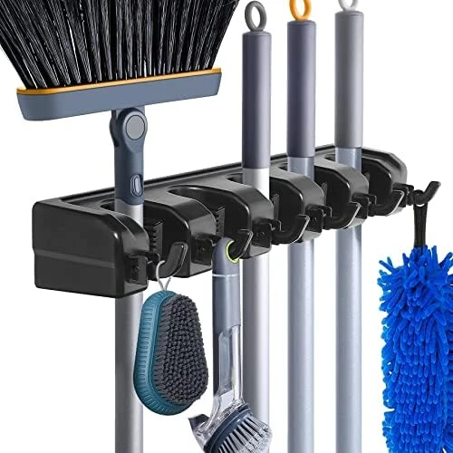 - NO-SLIDE Design Broom Organizer- 5 spring-loaded slots with rubber grips that hold tightly to tool handles to keep them firmly in place. 6 Heavy Duty hooks are movable