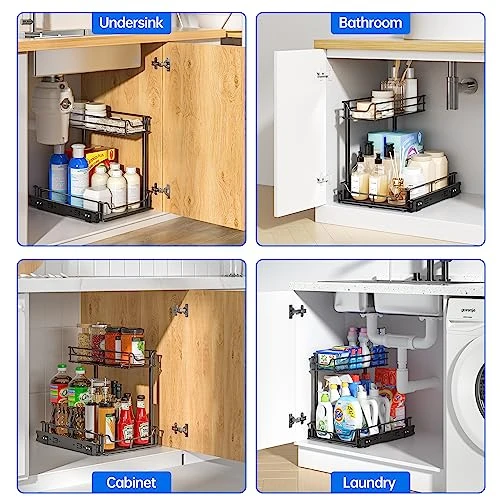 - Suitable for Multiple Applications: This pull out cabinet organizer works wonders in your kitchen, living room, dining room, bedroom, garage, laundry room, and office to organize it all like kitchenware, seasoning, cleaning supplies, personal care items, fruits, vegetables, beverages, snacks, books, cosmetics and more. LAMU under the sink organizer offers a smart solution to all your organizing needs
