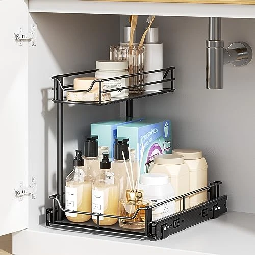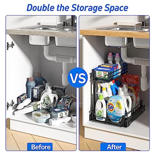 - Heavy Duty & Smooth Slide: Equipped with heavy-duty industrial-grade ball-bearing sliding rails and a sturdy support rod system, our under sink organizer allows you to store up to 100 pounds heavy items effortlessly without any fear of deformation. Glides smoothly, silently, and securely. Additionally, our undersink organizers also with a safety bumper to prevent derailment