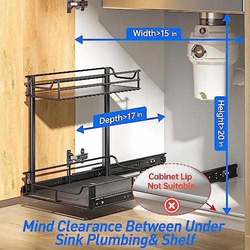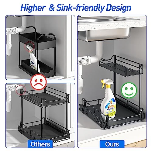 - Raised Height for Diverse Storage Needs: Our under kitchen sink organizer boast greater capacity compared to other kitchen sink organizer under cabinet with height increased by 2.4-4 inches extra, providing more storage space for tall detergent bottles, while a non-slip pad ensures that items stay securely in place when pulling the rail out