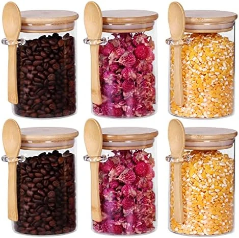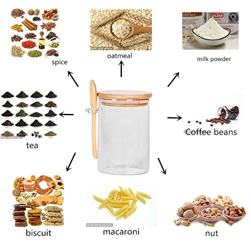 - [Highly Glass] The glass jars with bamboo lids and spoon are made of high-quality borosilicate glass and BPA free silicon which withstand temperature 0℉ to 400℉, you can put this airtight food canister in the pantry, kitchen corner or fridge.