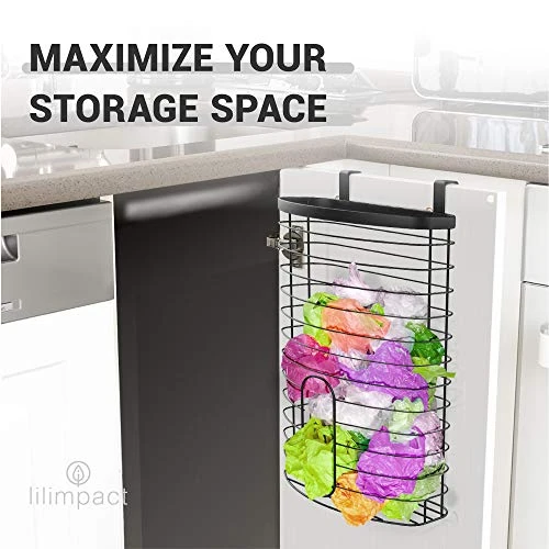 - STRONG METAL CONSTRUCTION – Lilimpact’s Cabinet Organizer is made of industrial-grade metal, which provides a durable, long-lasting structure. The sturdy metal construction prevents the hooks from bending or breaking. The large basket provides plenty of room to store plastic bags; Keep your grocery bags contained, and your cabinets clutter-free.