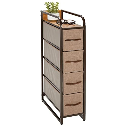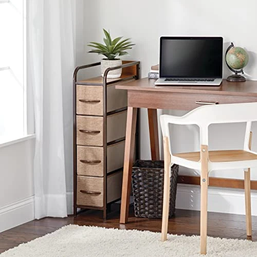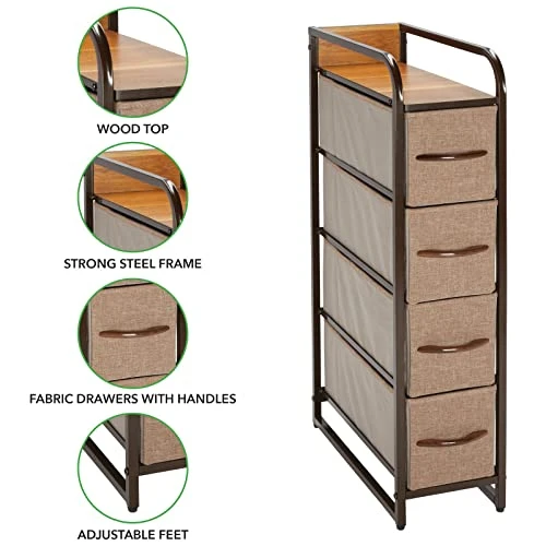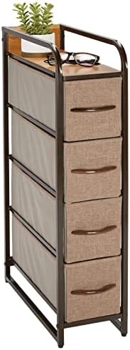 - STYLISH SMART STORAGE: This furniture stand boasts a slim, lightweight design to easily fit into smaller spaces while still providing plenty of storage space; Wood top provides a hard surface to place lamps, books, decor and more; The generously sized removable drawers have an easy-pull wooden handle to make opening and closing simple; Plastic feet will not scratch flooring, and they are adjustable for uneven surfaces; Elevated side handles make it easily portable so you can move it anytime