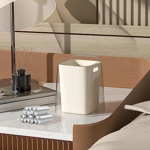 - 【Mini Size】 1.5l / 0.5 Gal Mini Countertop Trash Can, 5.5″W x 5.5″D x 5.9″H. 5 Rolls of Matching Garbage Bags Will Be Sent Upon Order. A small shape moves freely. Fit to desks, kitchen table top, coffee tables, dressing tables, bedside tables, etc. It can also storage cosmetics and toiletries to keep your countertop neat.