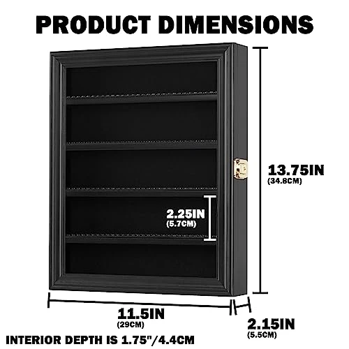 - Crafted from solid wood 11.5″W X 13.75″H X 2.15″D (Outside). Space between shelves is 2.25″. Interior depth is 1.75″. Please measure your figures first to determine whether they would fit.