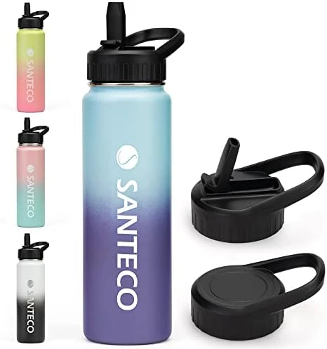 - Multiple Size & Color Options SANTECO insulated water bottle perfectly meets your comprehensive drinking needs from 24oz to 64oz. With the latest gradient colors applied on the premium powder coating materials. Outfits in both the function & looks. What’s more, the drinkware accessories also help to better your drinking. SANTECO is worth your try.