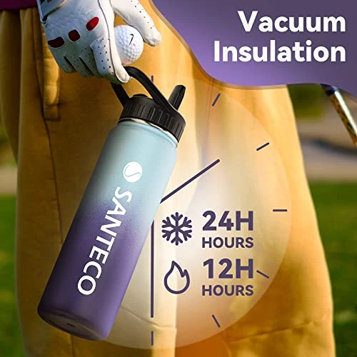 - 🧊 Vacuum Insulated for 24H Colding🧊 Perfectly Vacuum Sealed with double-wall stainless steel to enhance the insulation performance. Santeco outdoor water bottle keeps cold for 24h or hot for 12h, allowing drinks to stay icy cold & piping hot.