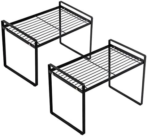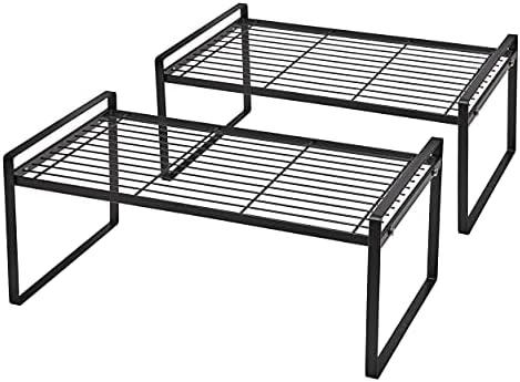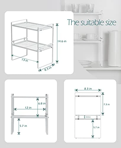 - EXTRA SPACE: These stackable cabinet shelves maximize storage efficiency, providing more spaces as a riser which allows you to use the upper space. The added storage space helps organization and tidiness. All the wee little bottles, tins, vials, pans and a myriad of other kitchen utensils could go underneath, the middle or the top of the cabinet shelf, reaching with ease.