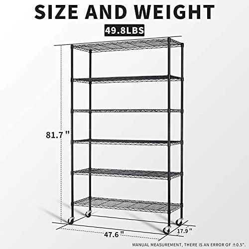 Storage Metal Shelf Wire Shelving Unit With Wheels 82″x48″x18″ Sturdy Steel Heavy Duty 6 Tier Layer Rack With Casters For Restaurant Garage Pantry Kitchen Garage Rack Black