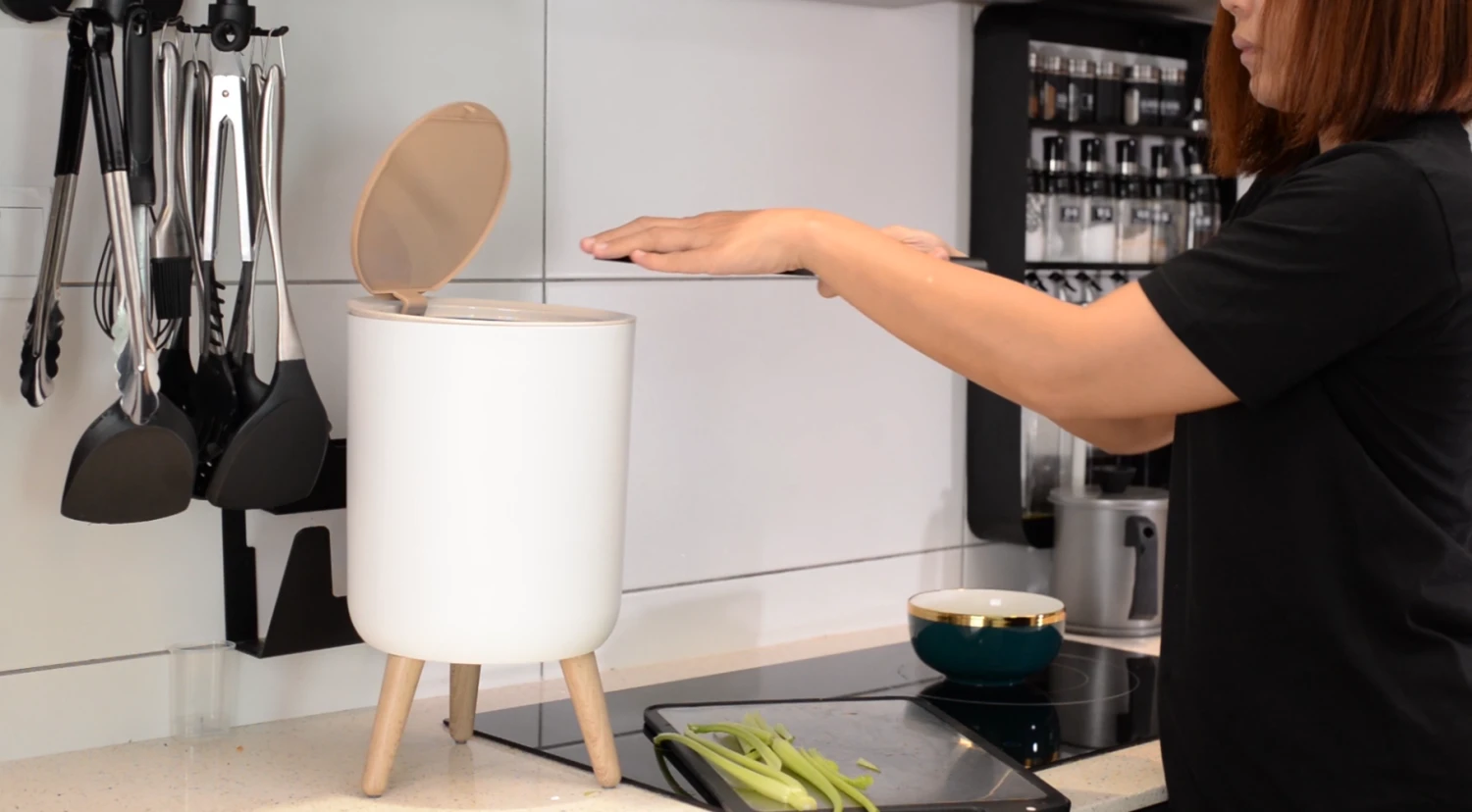 - ✅【INNOVATIVE PUSH-TO-OPEN LID】: Odorless and constructed to prevent pets from overturning the trash can, you can be assured of no foul play! Covered via its wood grain design lid, it effectively avoids smell from the trash to be released therefore improving the quality of life at home. To use, you can simply press the mark on the lid to open. Additionally, the lid can be held open at a 90 degree angle so you don’t have to manually keep the lid open when cleaning up.