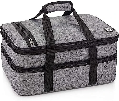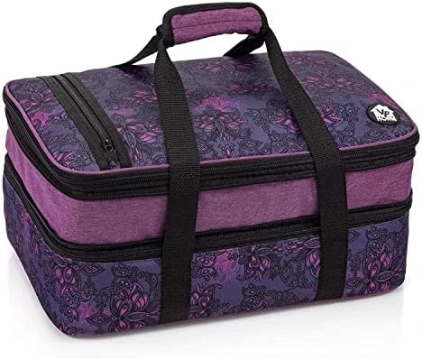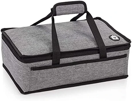 - Each casserole bag has a large main compartment on the bottom and an expandable top compartment. Easy to carry handle and exterior zippered pocket for holding serving utensils or napkins, etc.